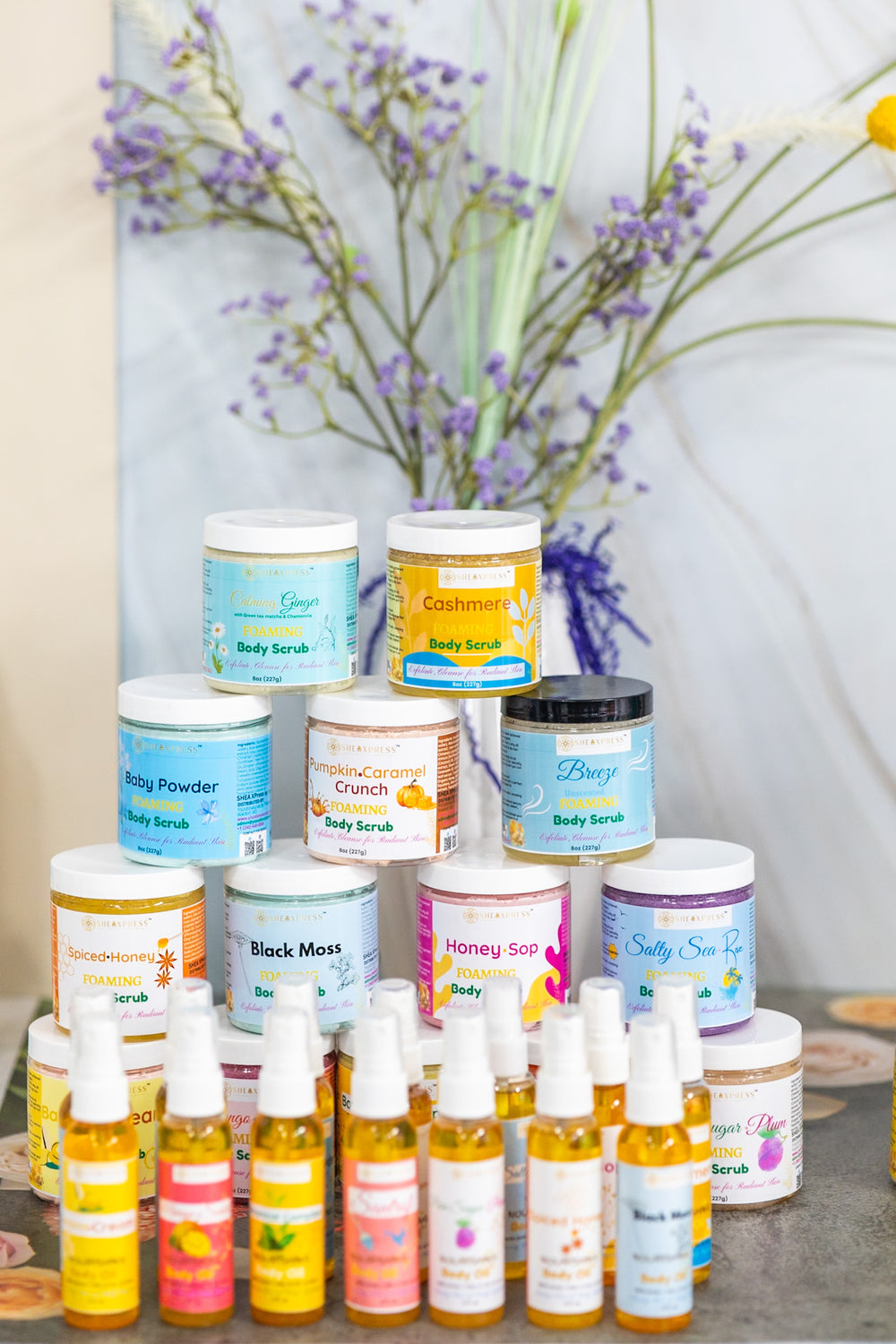 ✨ Exfoliating Sugar Scrub – A decadent polish that gently buffs away dull, dry skin, leaving a silky-smooth finish and a healthy glow.