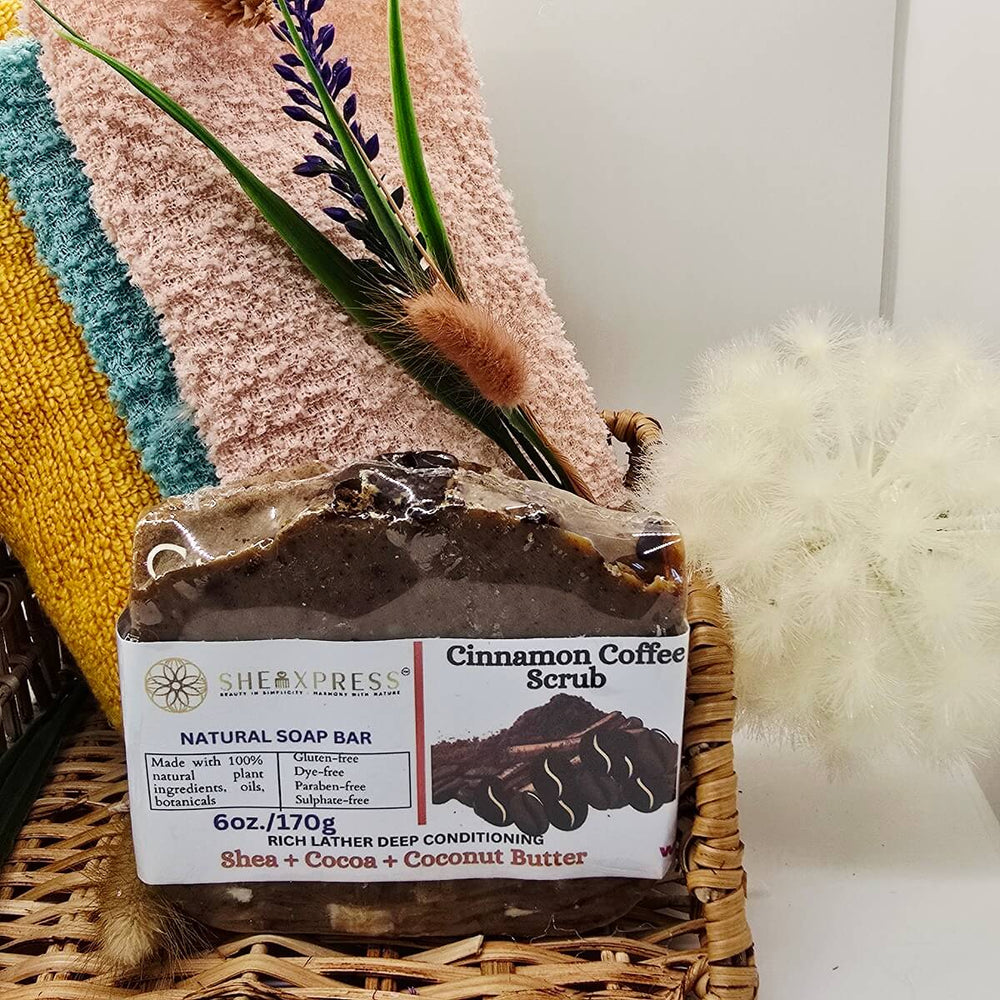 Awaken your senses with the SheaLuxe Cinnamon Coffee Scrub Soap Bar; a luxurious, conditioning soap crafted with shea butter, cocoa butter, and natural oils. The creamy, rich lather cleanses without stripping; while ground coffee provides gentle exfoliation for smooth, revitalized skin.