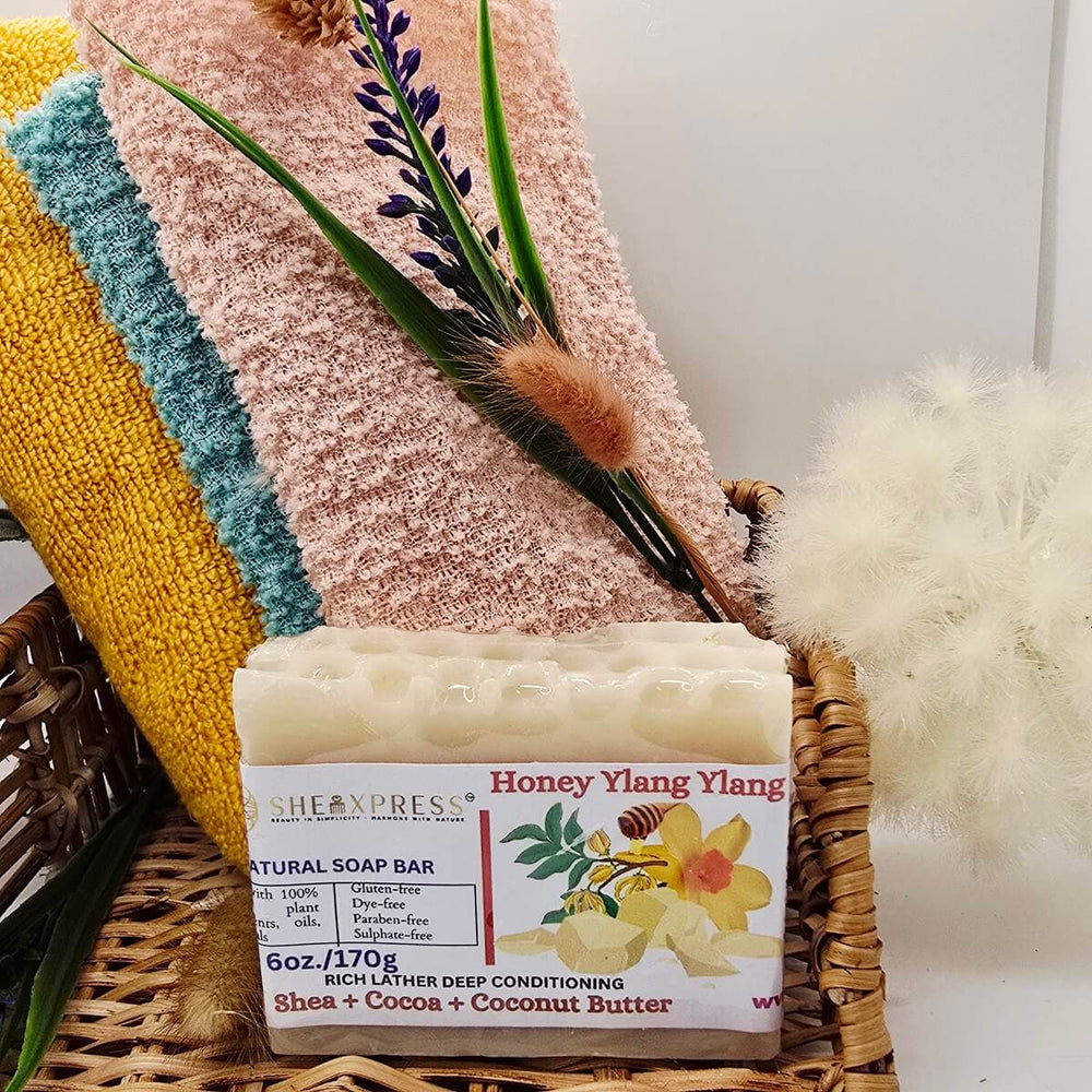 Indulge your skin with the SheaLuxe Honey Ylang Ylang Soap Bar, a rich, conditioning soap crafted with shea butter, cocoa butter, and natural oils for a deeply moisturizing, non-stripping cleanse. The creamy lather pampers your skin while turning your bath into a luxurious self-care ritual.