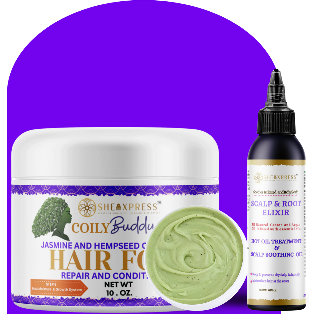 Nourish your scalp and feed your strands with the SheaXpress Hot Oil Scalp & Root Elixir + Hair Food Care Duo; a two-step system designed to strengthen roots, restore moisture, and support healthy hair growth. Infused with nutrient-rich botanicals, this set delivers deep scalp care and long-lasting hydration for coily, curly, and textured hair.