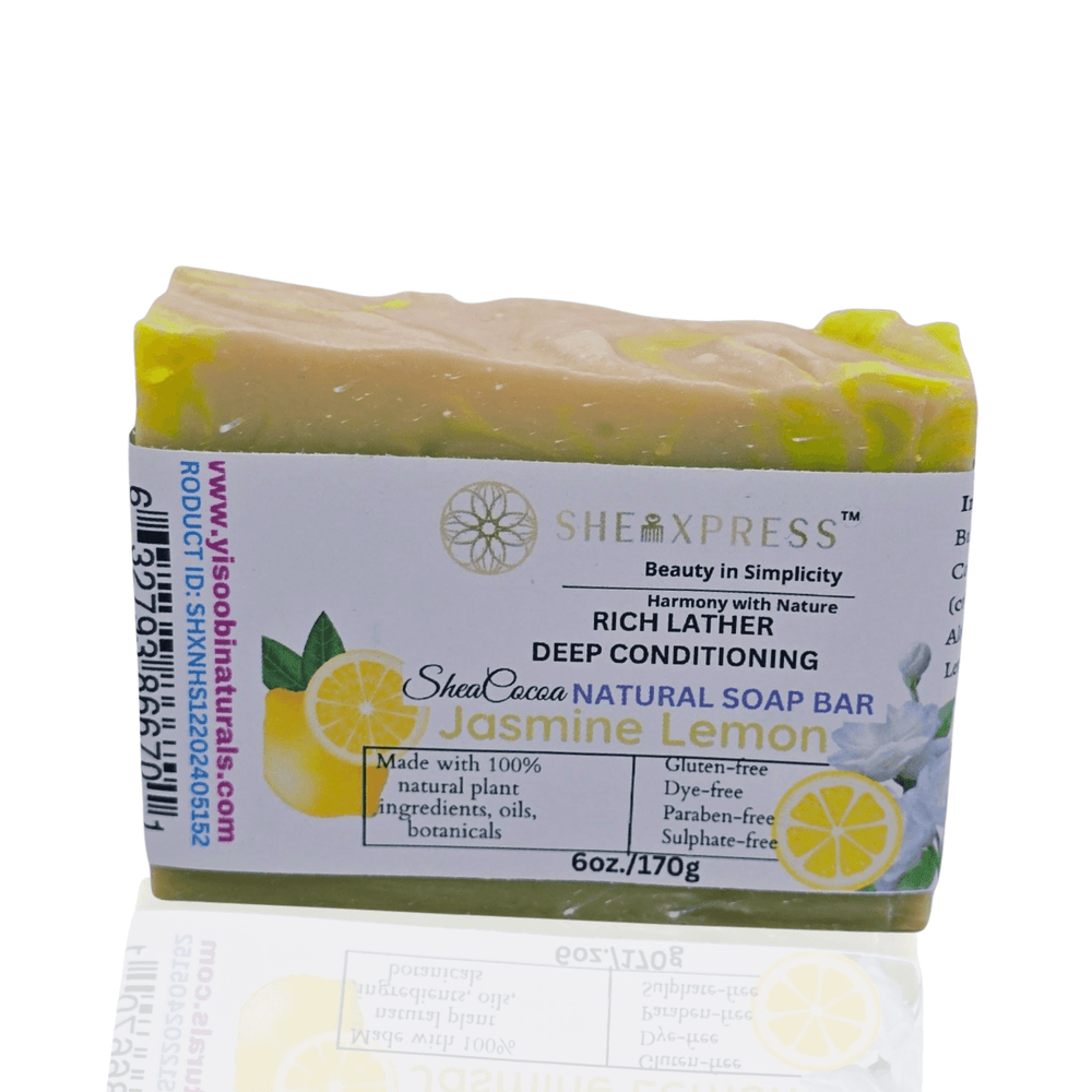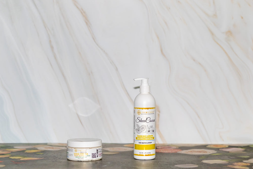 Brighten your day and pamper your skin with the SheaXpress Shea-Cocoa Jasmine Lemon Trio; a 3-piece body care set crafted with unrefined shea butter, rich cocoa, soothing aloe, and nourishing botanical oils. Infused with the delicate floral notes of jasmine and the uplifting zest of lemon; this set delivers balanced hydration and a refreshing self-care ritual.