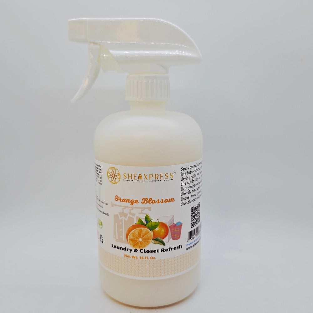 The SheaXpress Laundry & Closet Refresh is a plant-based fabric and linen spray designed to refresh in between washes. Infused with the bright, floral essence of orange blossom, it gently deodorizes and leaves behind a crisp, long-lasting fragrance. Perfect for clothing, bedding, towels, closets, and even upholstered furniture, this spray brings a burst of freshness wherever it is used.