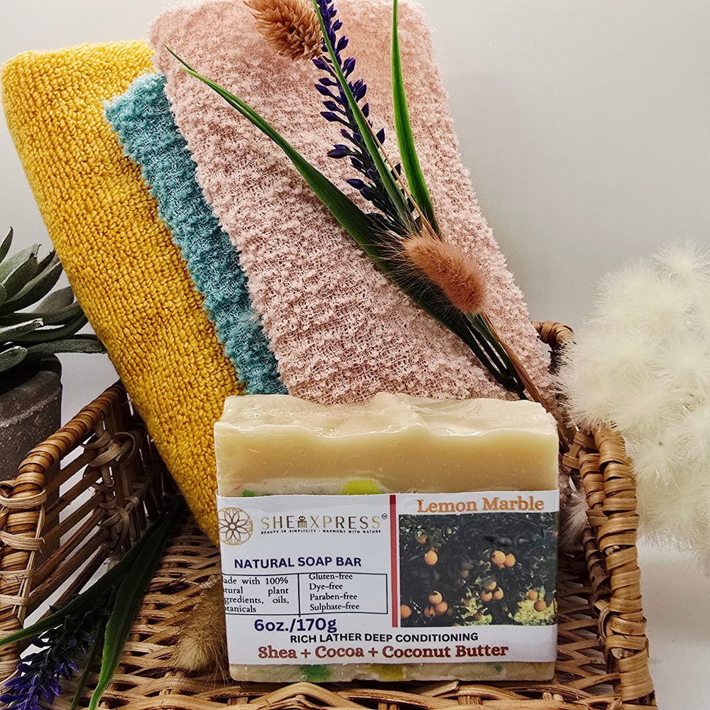 Elevate your bath time with the SheaLuxe Lemon Marble Soap Bar — a luxurious, conditioning soap made with shea butter, cocoa butter, and nourishing natural oils. Its creamy, gentle lather cleanses without stripping, leaving skin soft, hydrated, and pampered.