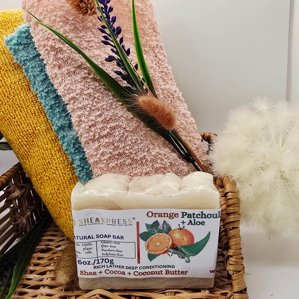 Refresh and restore your skin with the SheaLuxe Orange Patchouli & Aloe Soap Bar; a luxurious conditioning soap enriched with shea butter, cocoa butter, and moisturizing natural oils. Its creamy, gentle lather cleanses without stripping; leaving skin soft, hydrated, and pampered.