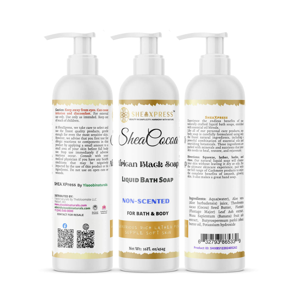 The Unscented African Black Soap Liquid Soap is crafted for sensitive and fragrance-conscious skin. Made with traditional African black soap ingredients—shea butter, cocoa pod ash, and natural oils—it delivers a gentle yet effective cleanse that supports clear, healthy-looking skin. Perfect for daily use on face, body, and hands.