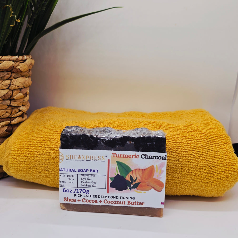 Purify and pamper your skin with the SheaLuxe Turmeric and activated Charcoal Soap Bar; a conditioning, moisture-rich soap crafted with shea butter, cocoa butter, and nourishing natural oils. Its creamy, gentle lather cleanses without stripping; while activated charcoal helps draw out impurities for a refreshed, balanced complexion.